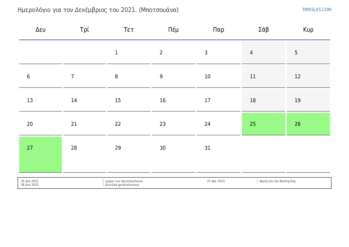Ημερολόγιο αργιών και Σαββατοκύριακων για το Δεκέμβριος του 2021 για την Μποτσουάνα