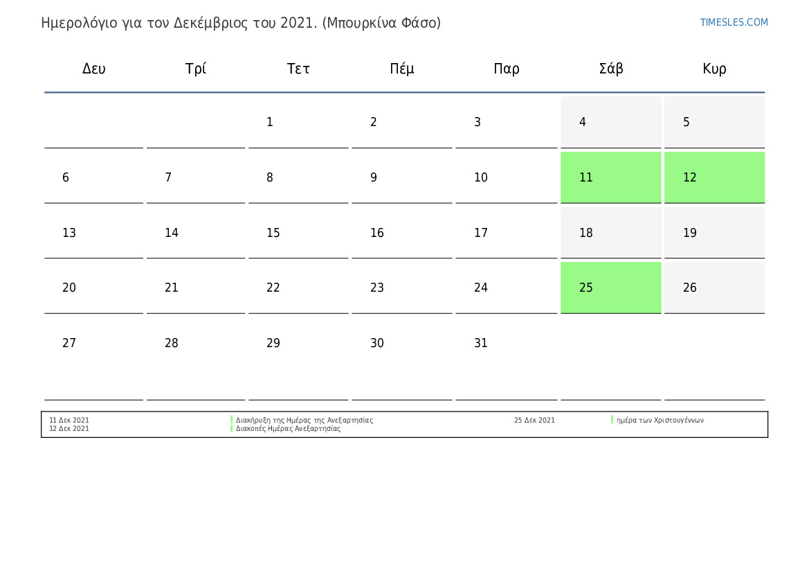 Ημερολόγιο αργιών και Σαββατοκύριακων για το Δεκέμβριος του 2021 για την Μπουρκίνα Φάσο