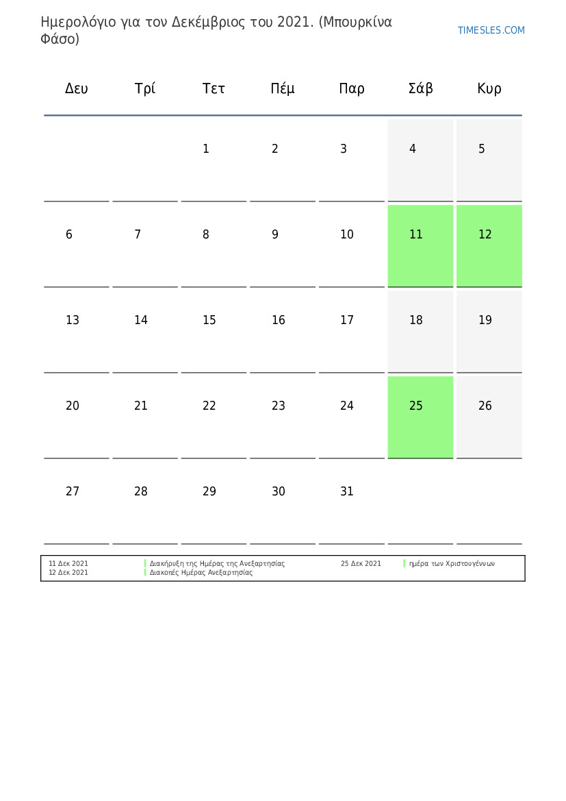 Λήψη και εκτύπωση ημερολογίου PDF με αργίες και σαββατοκύριακα για τον Δεκέμβριος του 2021 για την Μπουρκίνα Φάσο