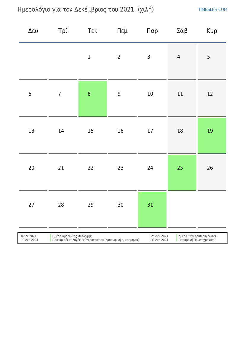 Ημερολόγιο Δεκέμβριος 2021 για τη Χιλή