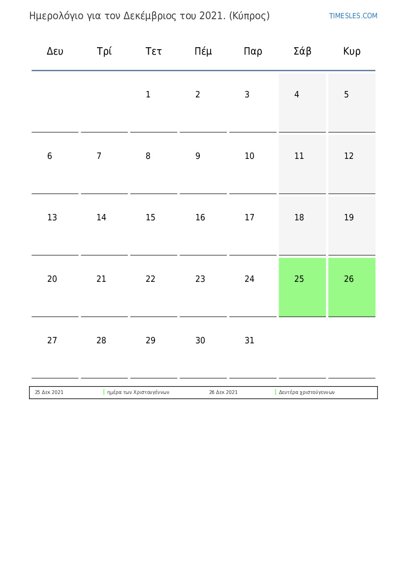 Λήψη και εκτύπωση ημερολογίου PDF με αργίες και σαββατοκύριακα για τον Δεκέμβριος του 2021 για την Κύπρο