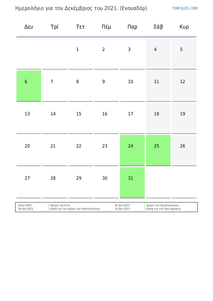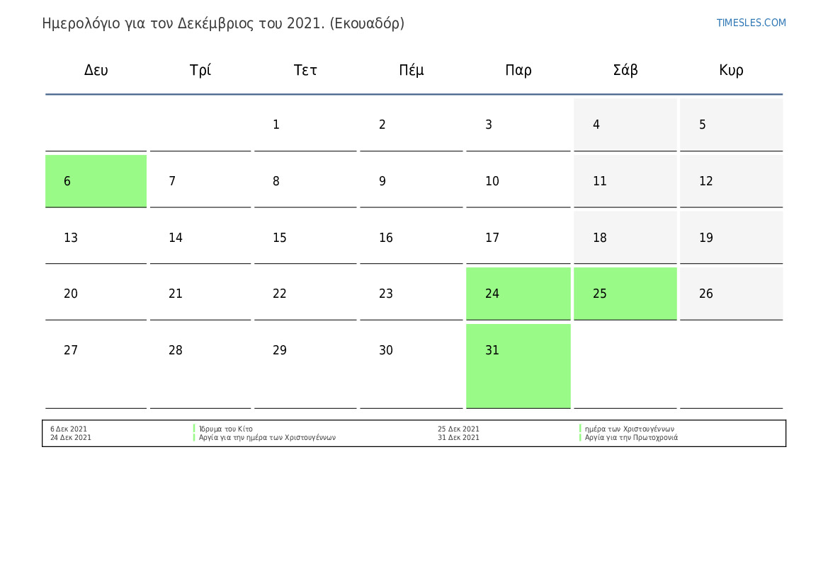 Ημερολόγιο Δεκέμβριος 2021 για τον Ισημερινό