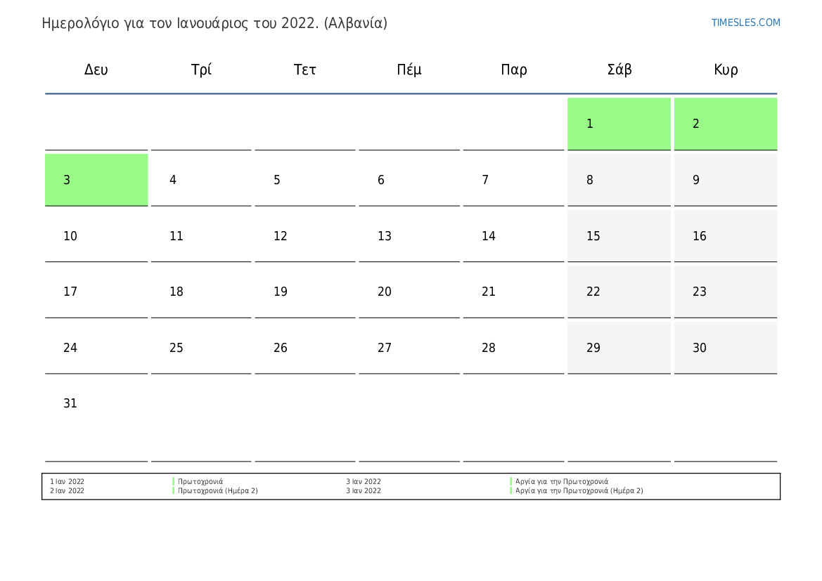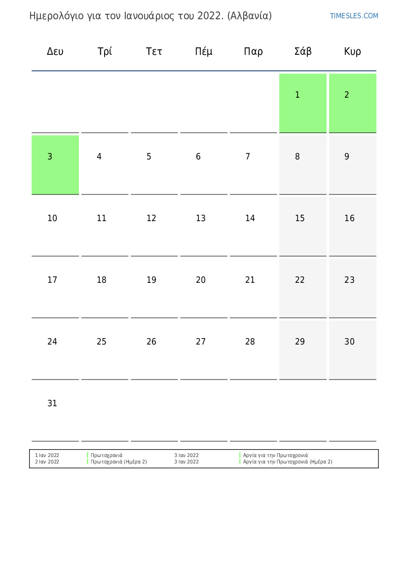 Ημερολόγιο αργιών και Σαββατοκύριακων για το Ιανουάριος του 2022 για την Αλβανία
