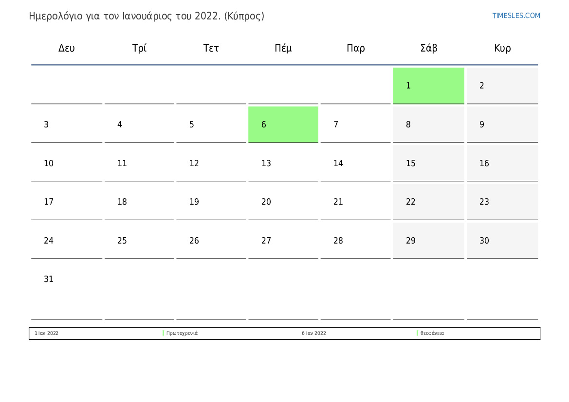 Ημερολόγιο αργιών και Σαββατοκύριακων για το Ιανουάριος του 2022 για την Κύπρο