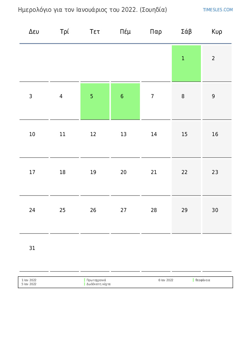 Ημερολόγιο αργιών και Σαββατοκύριακων για το Ιανουάριος του 2022 για τη Σουηδία