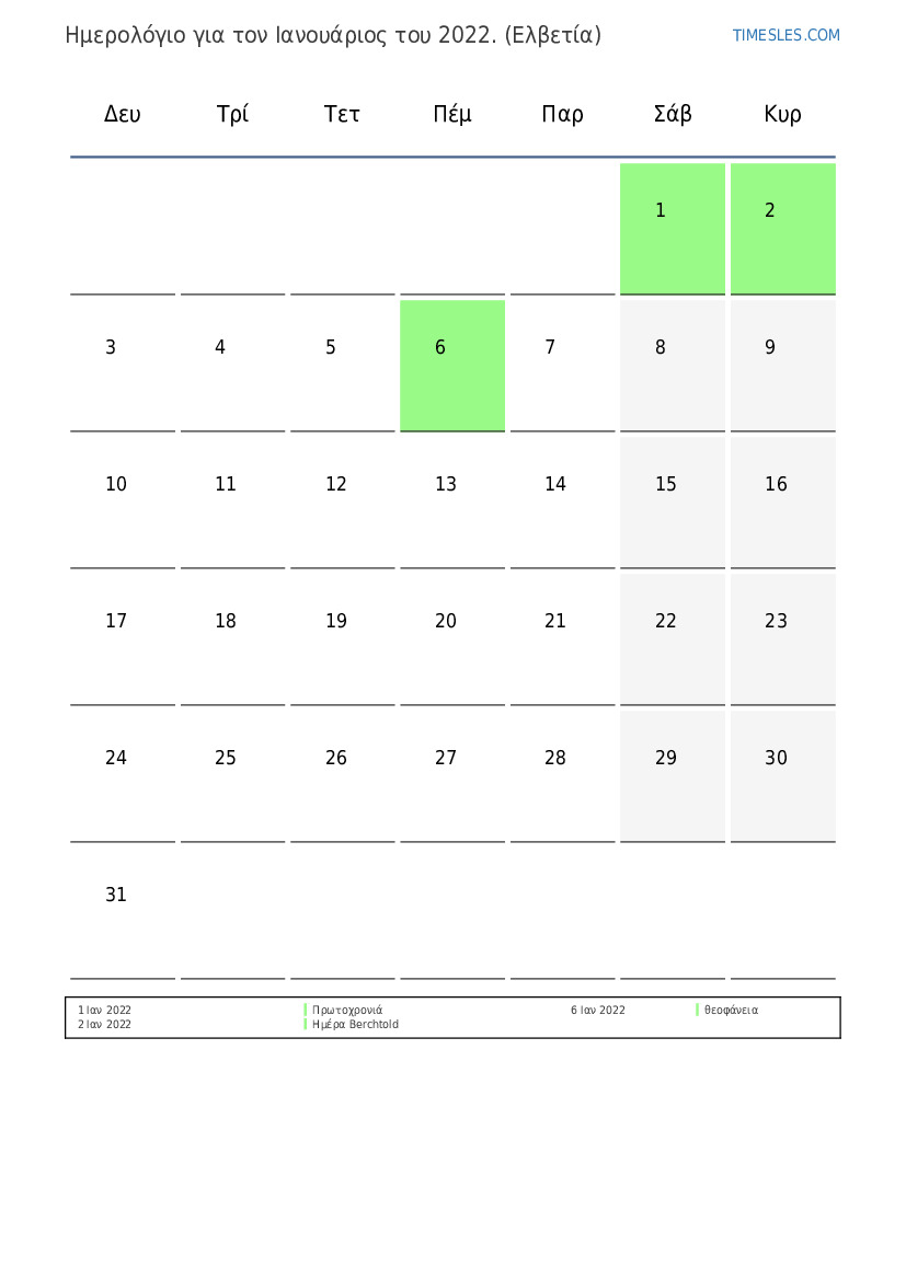 Ημερολόγιο Ιανουάριος 2022 για την Ελβετία