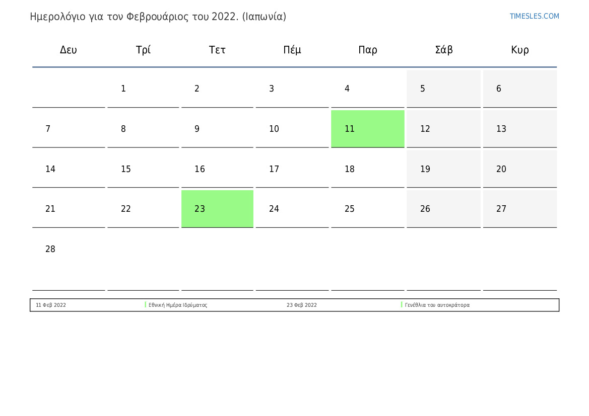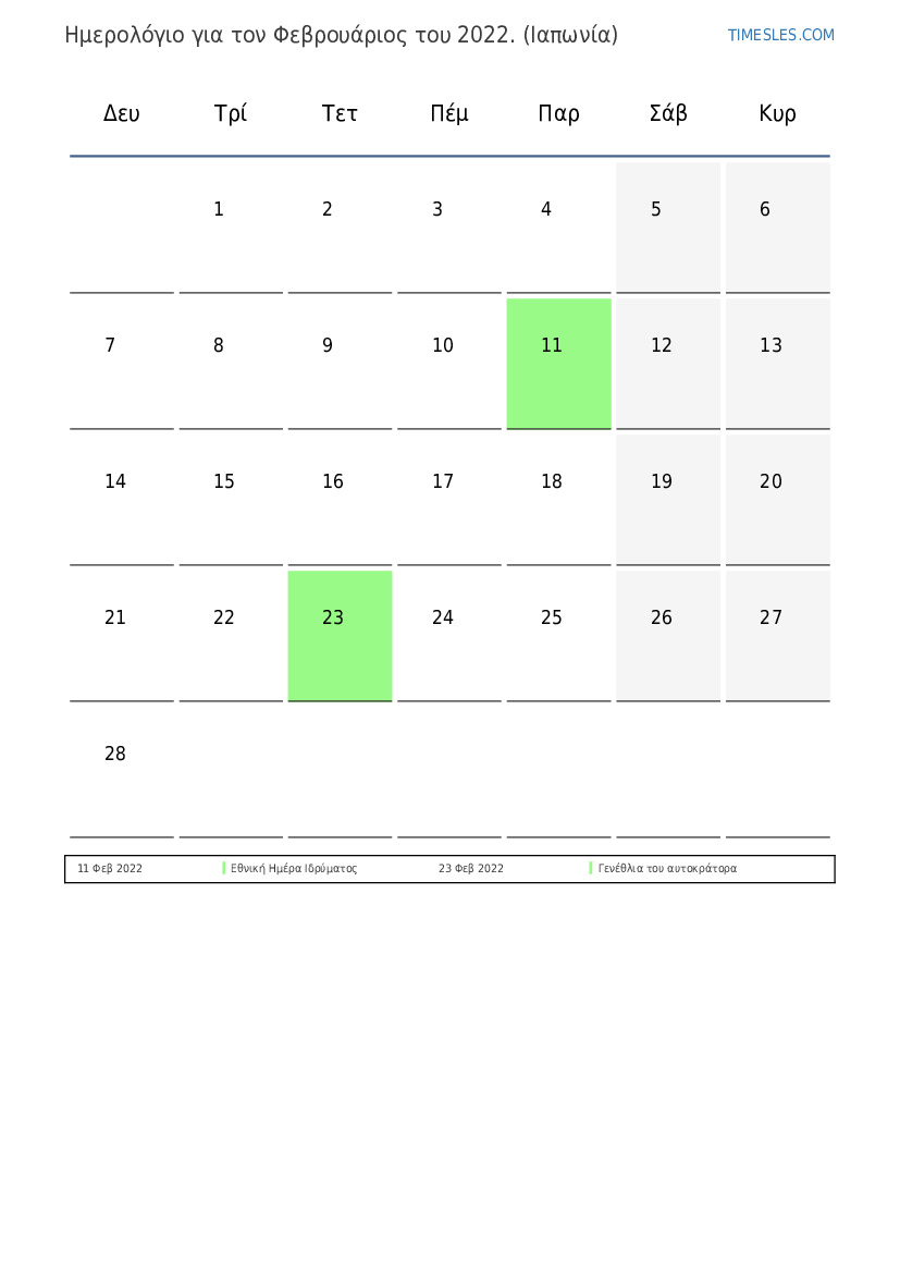 Ημερολόγιο αργιών και Σαββατοκύριακων για το Φεβρουάριος του 2022 για την Ιαπωνία