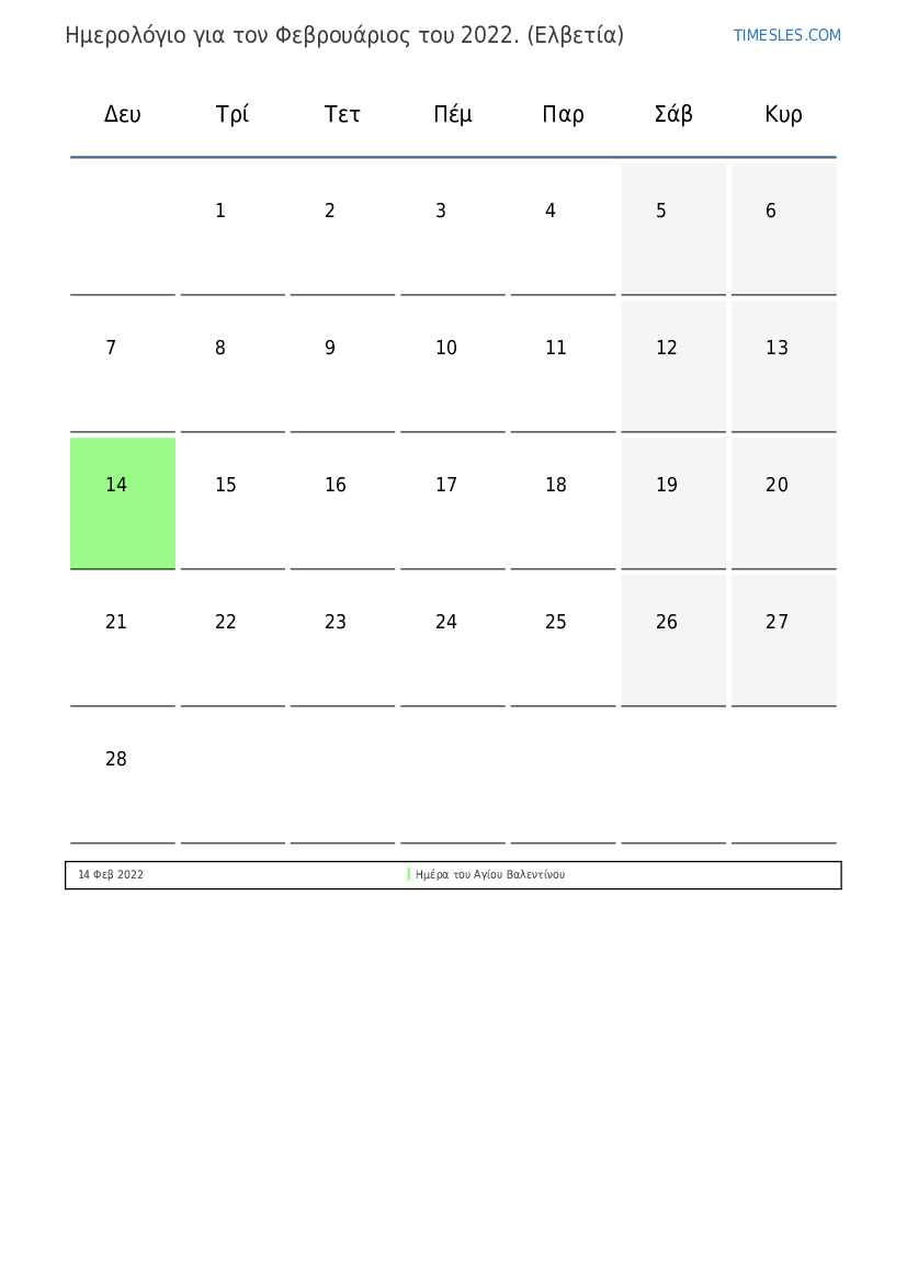 Ημερολόγιο Φεβρουάριος 2022 για την Ελβετία
