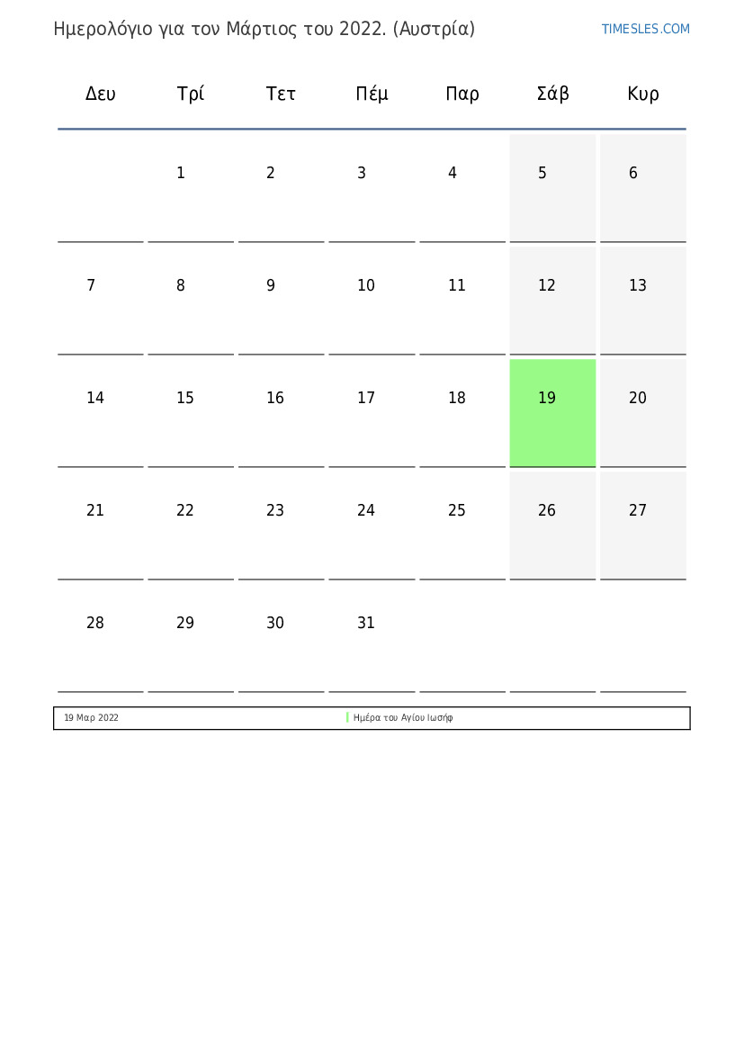 Λήψη και εκτύπωση ημερολογίου PDF με αργίες και σαββατοκύριακα για τον Μάρτιος του 2022 για την Αυστρία
