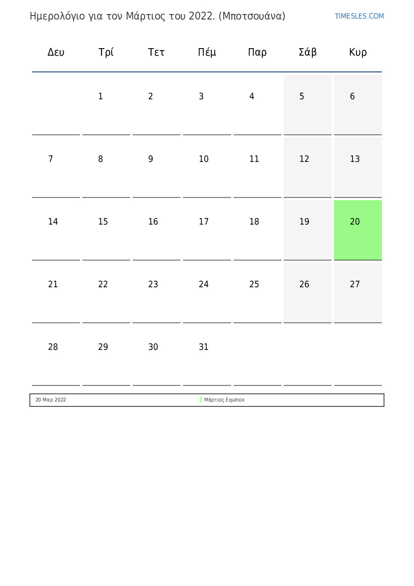 Λήψη και εκτύπωση ημερολογίου PDF με αργίες και σαββατοκύριακα για τον Μάρτιος του 2022 για την Μποτσουάνα
