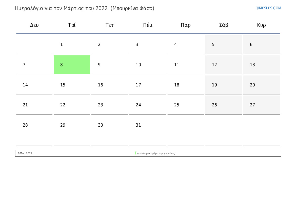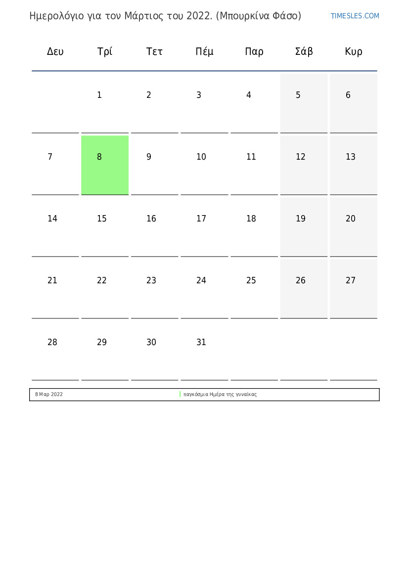 Ημερολόγιο αργιών και Σαββατοκύριακων για το Μάρτιος του 2022 για την Μπουρκίνα Φάσο