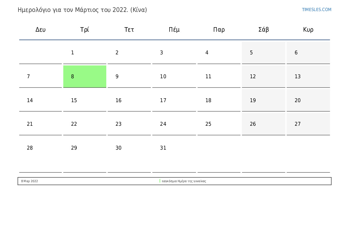 Ημερολόγιο αργιών και Σαββατοκύριακων για το Μάρτιος του 2022 για την Κίνα