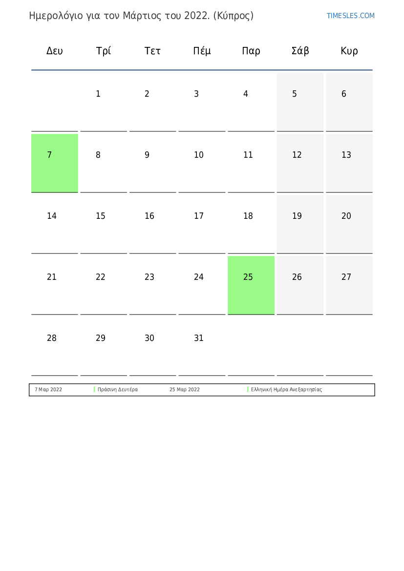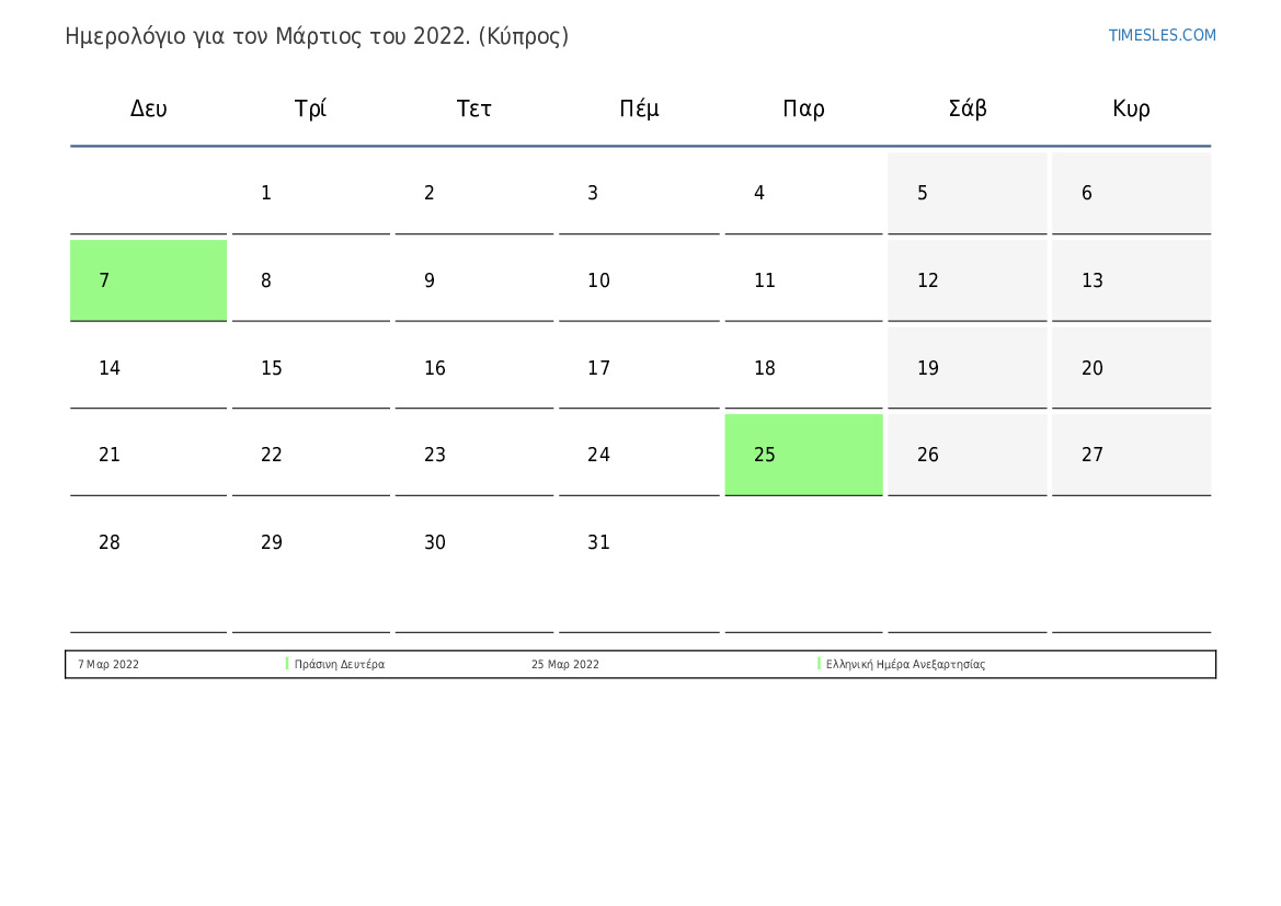 Ημερολόγιο αργιών και Σαββατοκύριακων για το Μάρτιος του 2022 για την Κύπρο