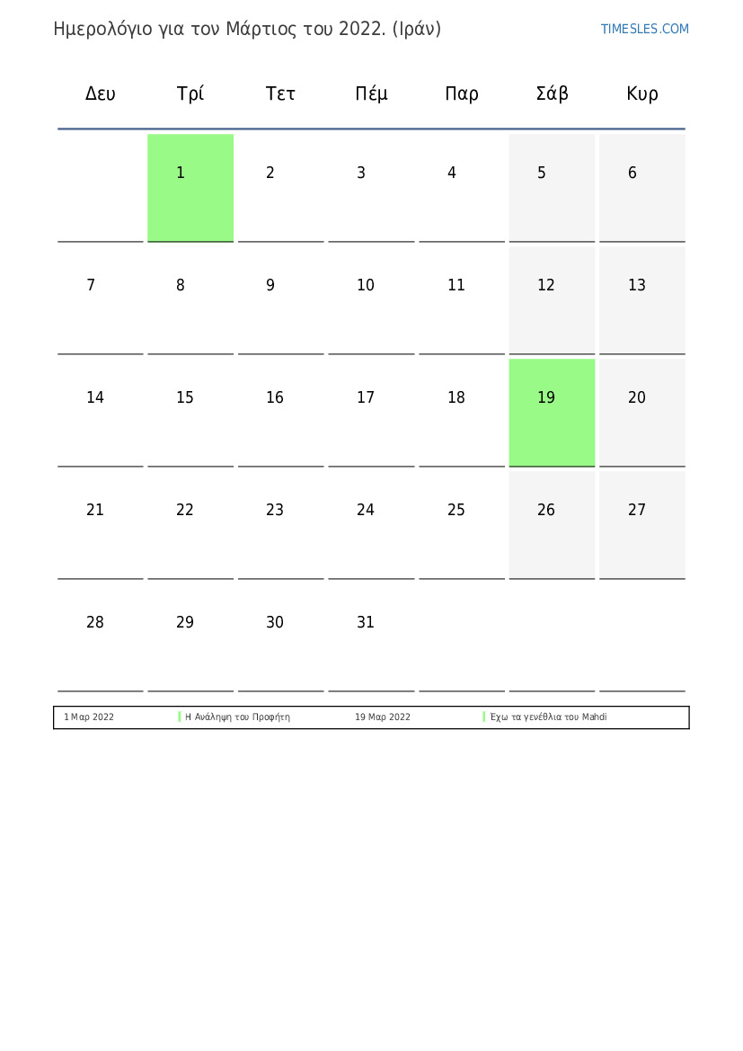 Ημερολόγιο αργιών και Σαββατοκύριακων για το Μάρτιος του 2022 για το Ιράν