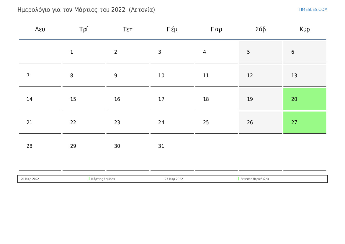 Λήψη και εκτύπωση ημερολογίου PDF με αργίες και σαββατοκύριακα για τον Μάρτιος του 2022 για τη Λετονία