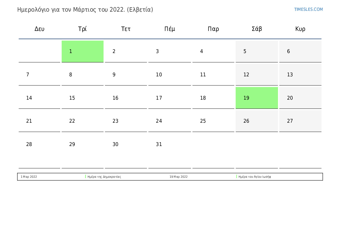Λήψη και εκτύπωση ημερολογίου PDF με αργίες και σαββατοκύριακα για τον Μάρτιος του 2022 για την Ελβετία