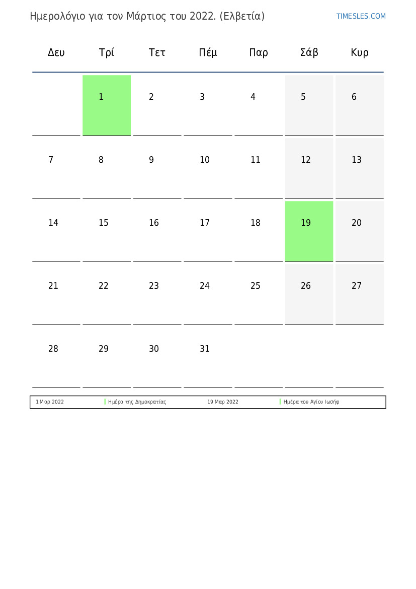 Ημερολόγιο αργιών και Σαββατοκύριακων για το Μάρτιος του 2022 για την Ελβετία