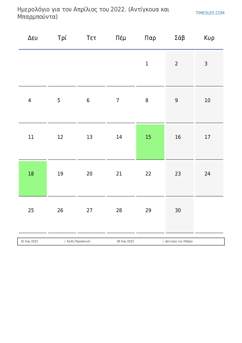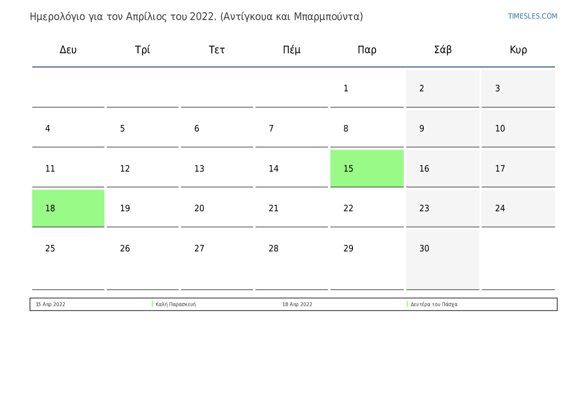 Ημερολόγιο Απρίλιος 2022 για Αντίγκουα και Μπαρμπούντα