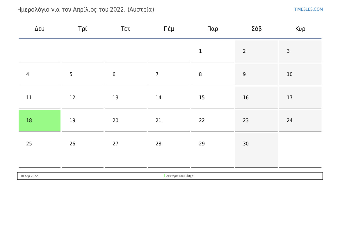 Ημερολόγιο αργιών και Σαββατοκύριακων για το Απρίλιος του 2022 για την Αυστρία