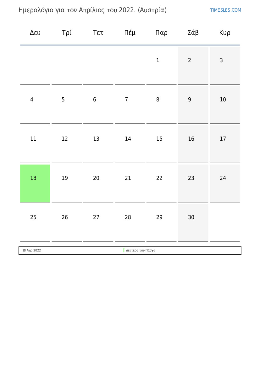 Λήψη και εκτύπωση ημερολογίου PDF με αργίες και σαββατοκύριακα για τον Απρίλιος του 2022 για την Αυστρία