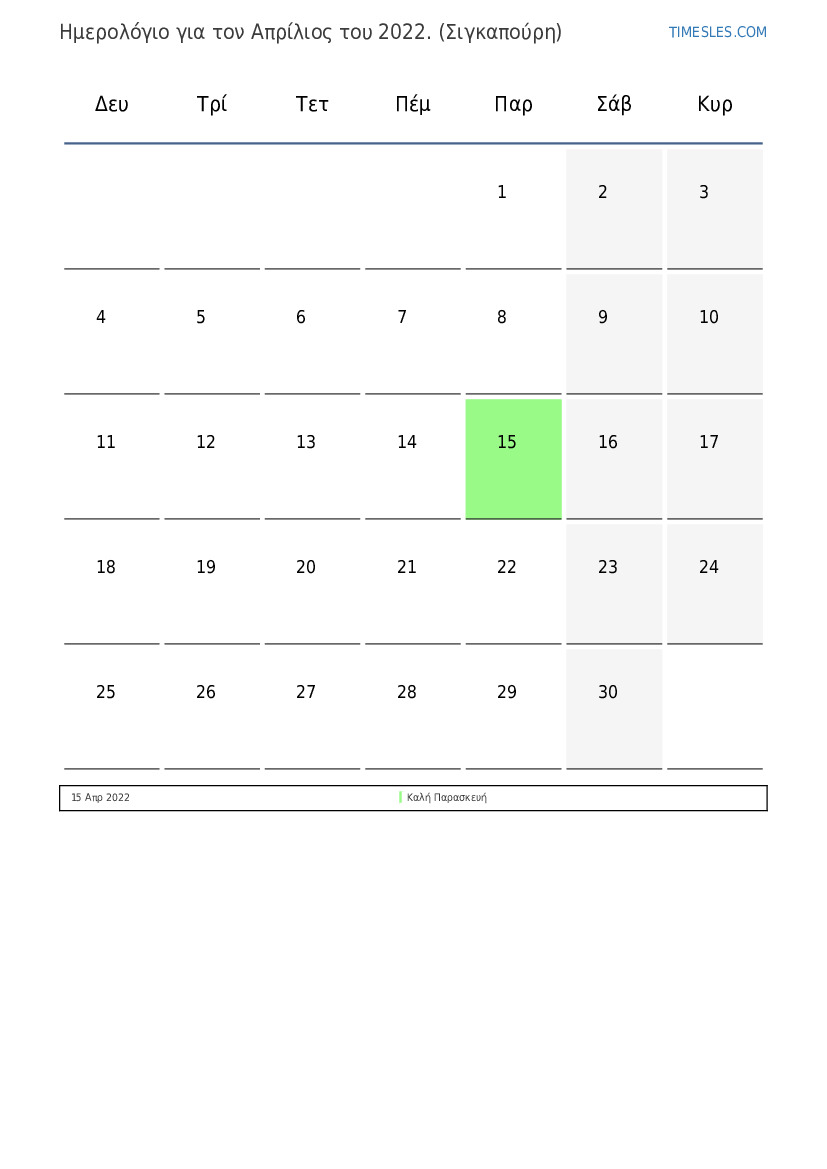 Ημερολόγιο Απρίλιος 2022 για τη Σιγκαπούρη