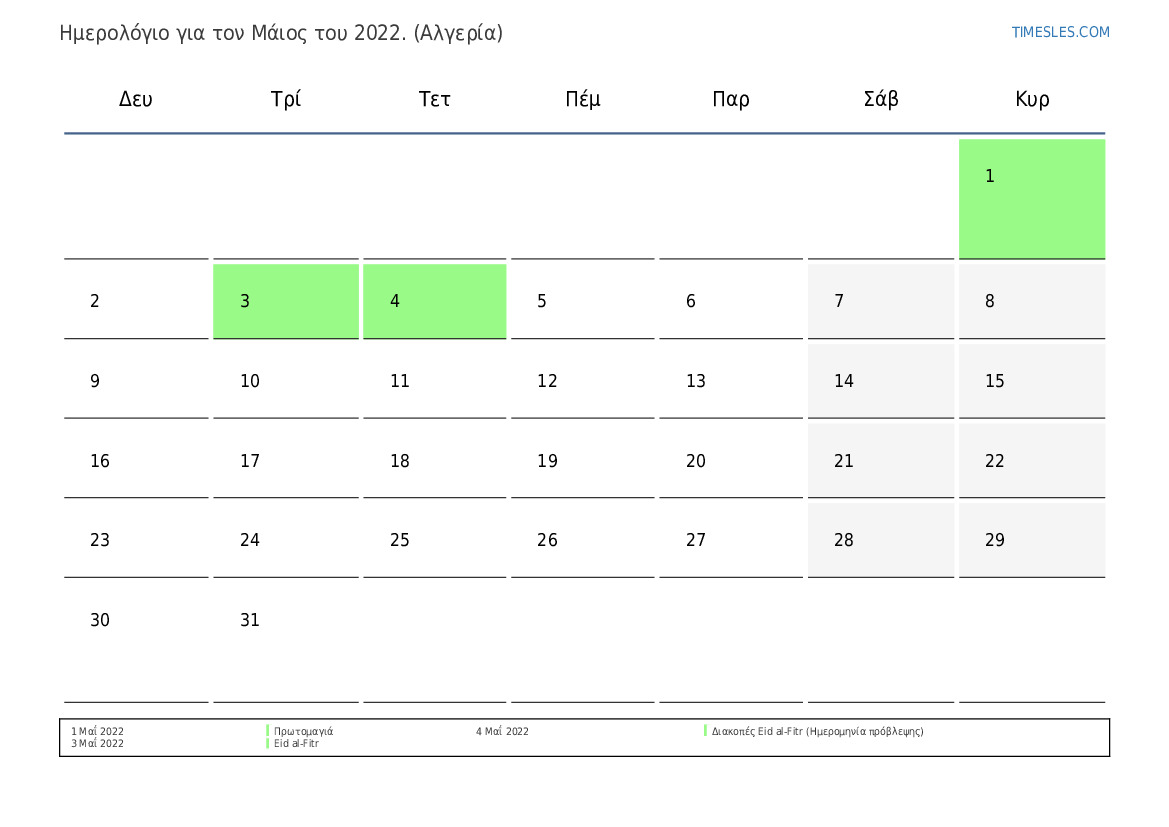 Ημερολόγιο αργιών και Σαββατοκύριακων για το Μάιος του 2022 για την Αλγερία