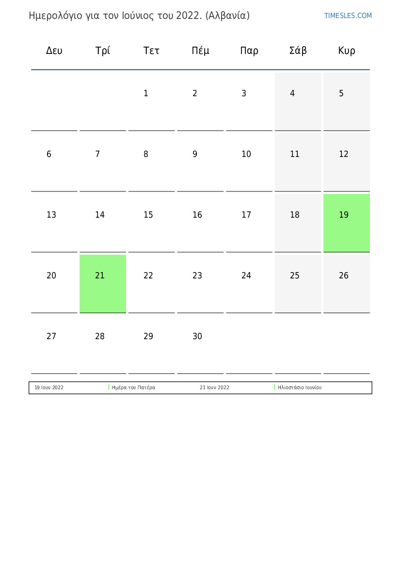 Ημερολόγιο Ιούνιος 2022 για την Αλβανία