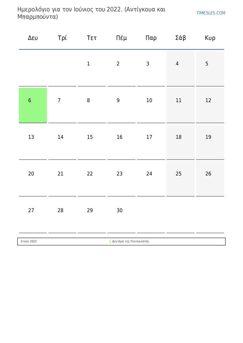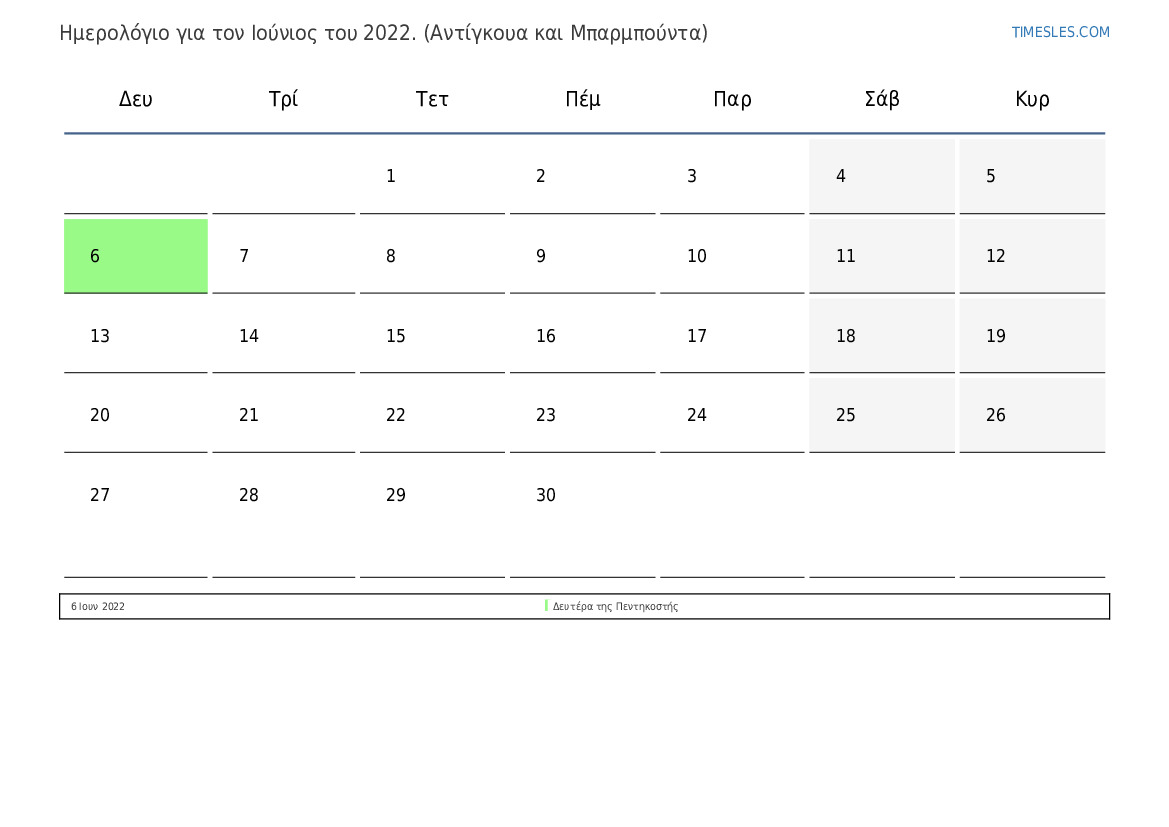 Ημερολόγιο Ιούνιος 2022 για Αντίγκουα και Μπαρμπούντα