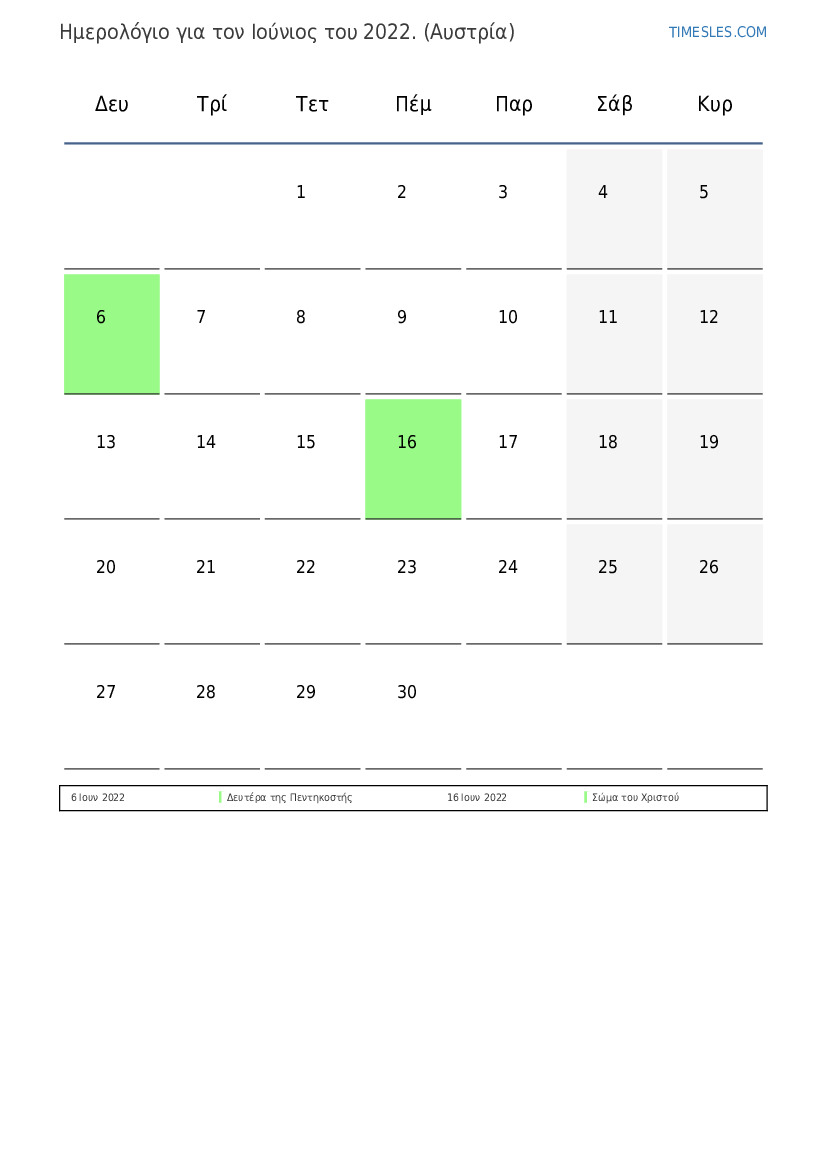 Ημερολόγιο Ιούνιος 2022 για την Αυστρία
