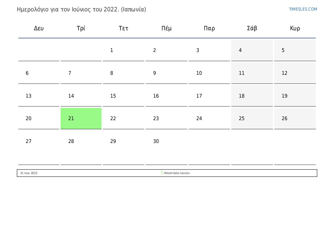 Λήψη και εκτύπωση ημερολογίου PDF με αργίες και σαββατοκύριακα για τον Ιούνιος του 2022 για την Ιαπωνία