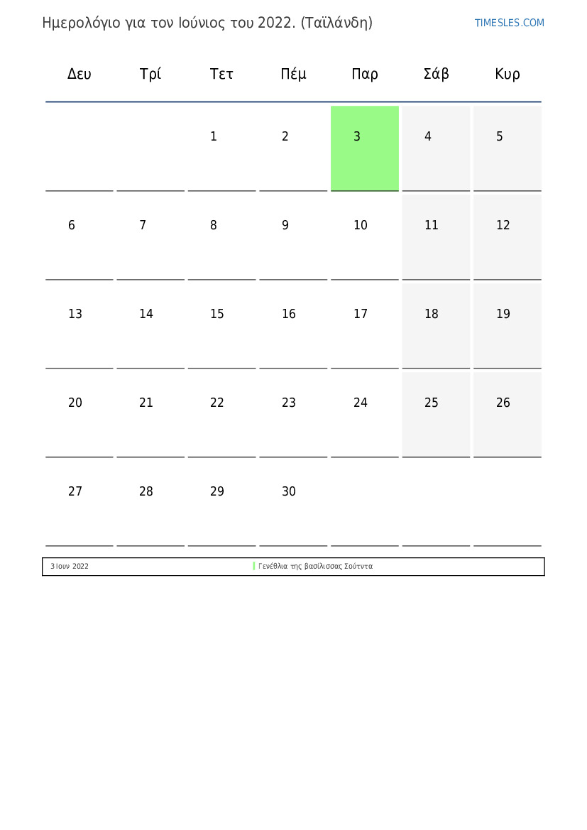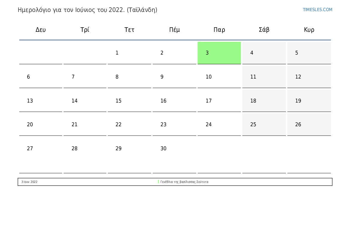 Ημερολόγιο Ιούνιος 2022 για την Ταϊλάνδη