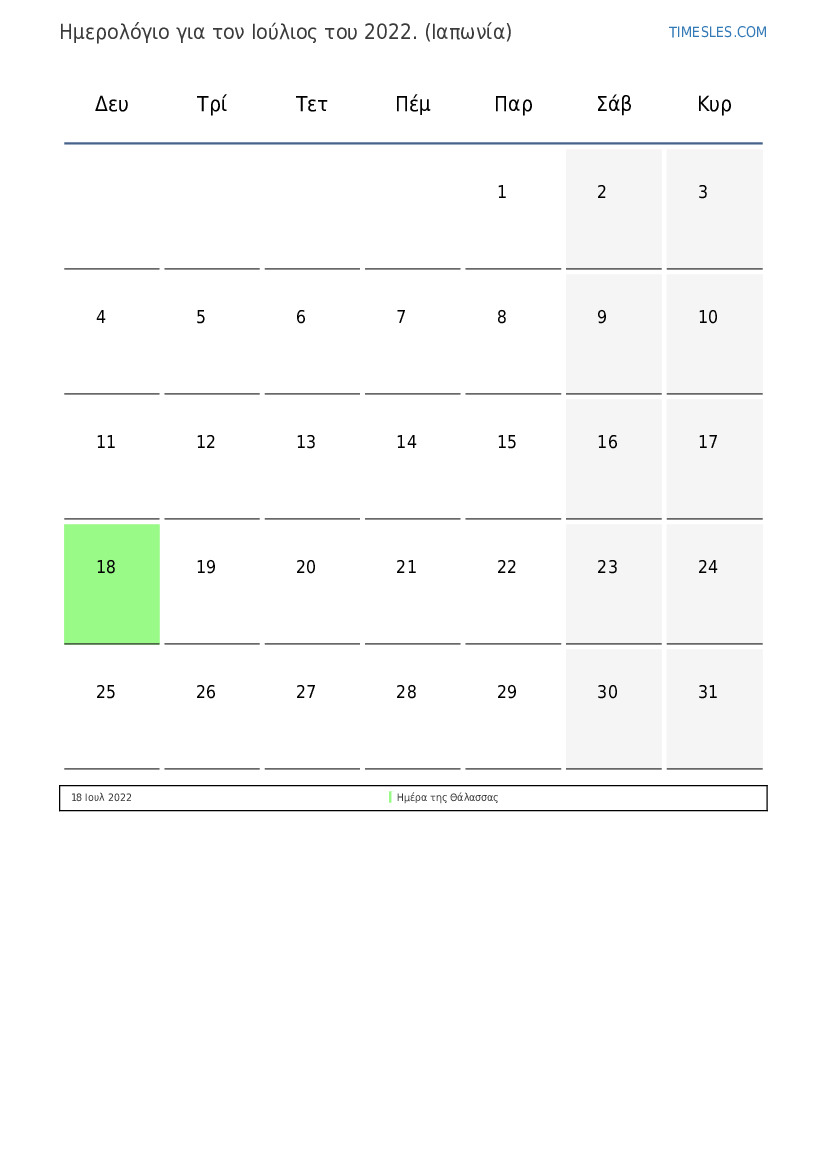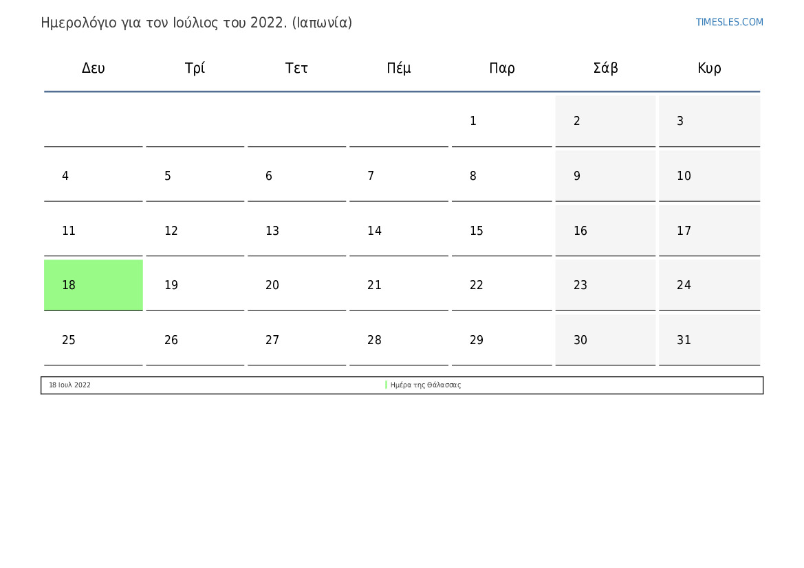 Ημερολόγιο αργιών και Σαββατοκύριακων για το Ιούλιος του 2022 για την Ιαπωνία