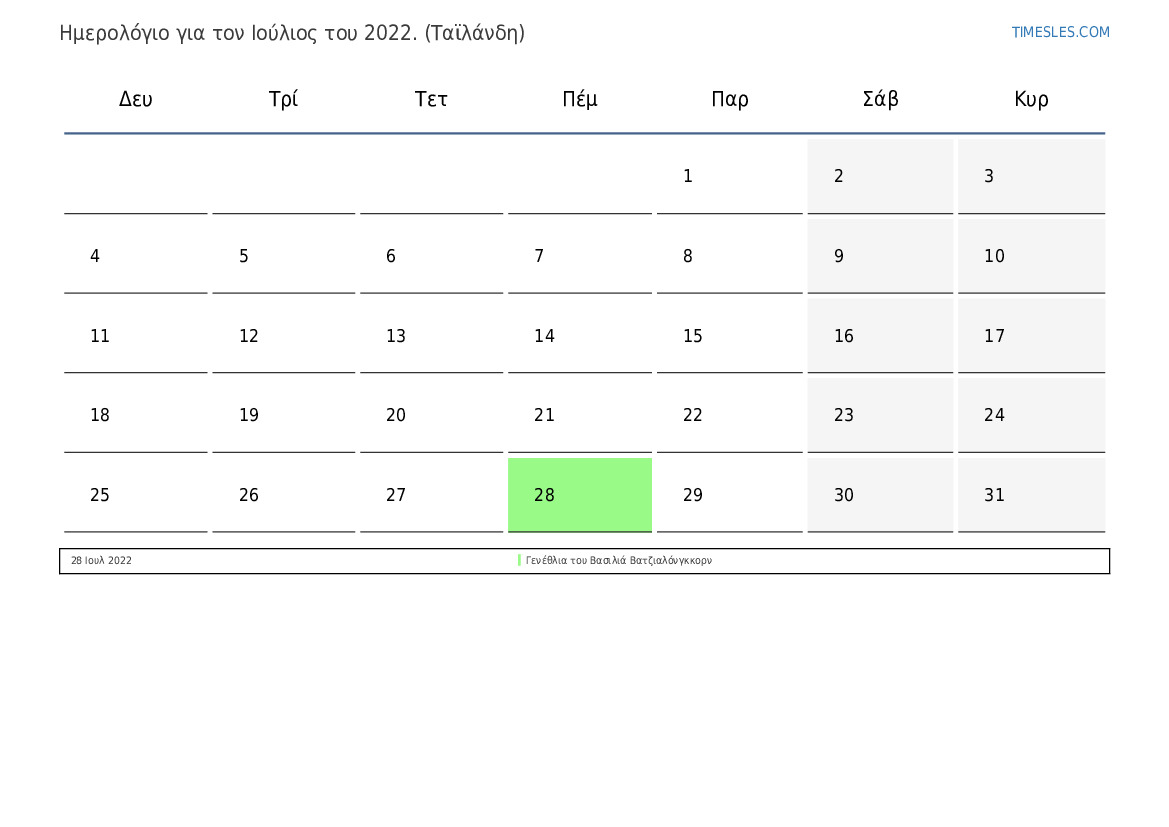 Ημερολόγιο Ιούλιος 2022 για την Ταϊλάνδη