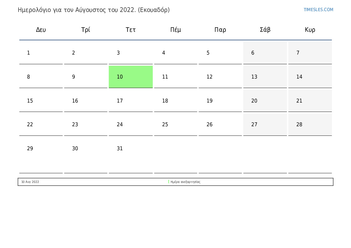 Ημερολόγιο Αύγουστος 2022 για τον Ισημερινό