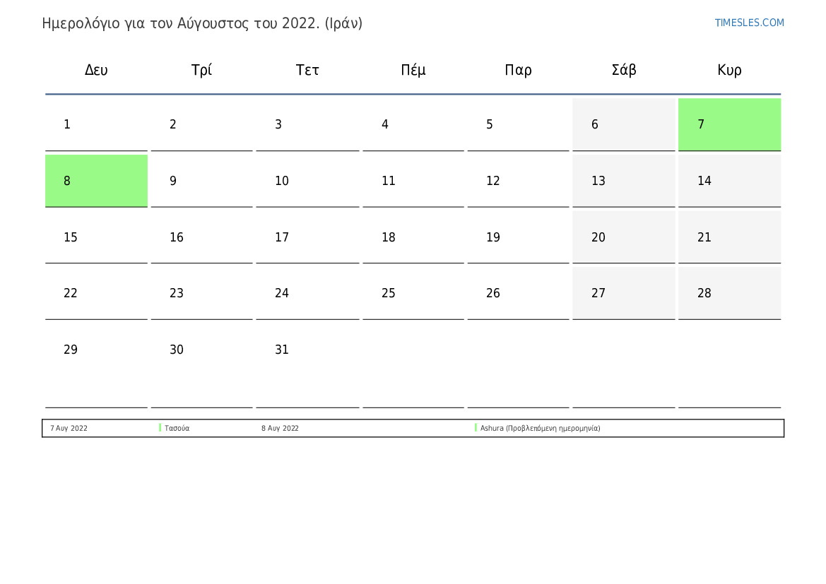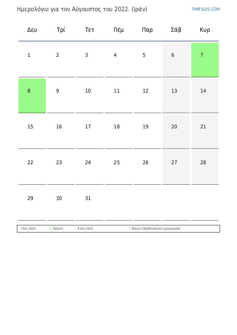 Ημερολόγιο αργιών και Σαββατοκύριακων για το Αύγουστος του 2022 για το Ιράν