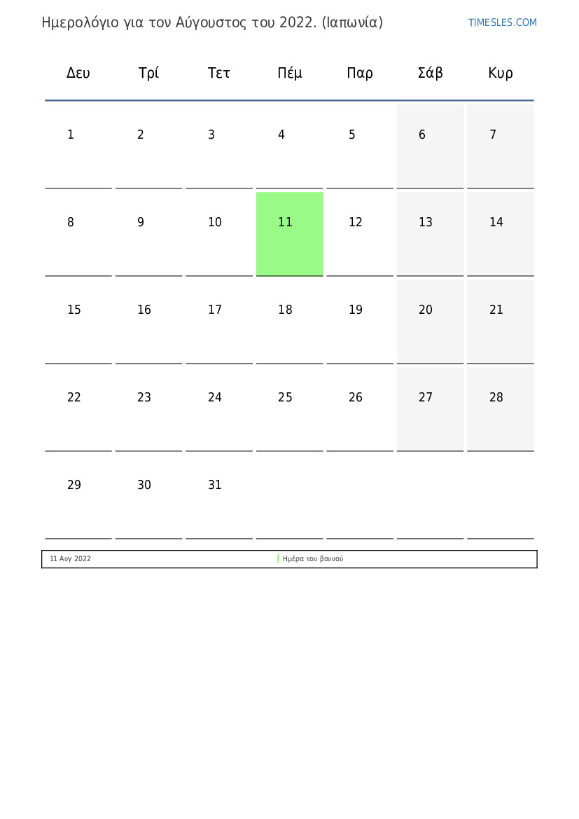Ημερολόγιο αργιών και Σαββατοκύριακων για το Αύγουστος του 2022 για την Ιαπωνία