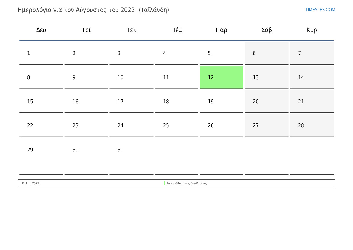 Ημερολόγιο Αύγουστος 2022 για την Ταϊλάνδη