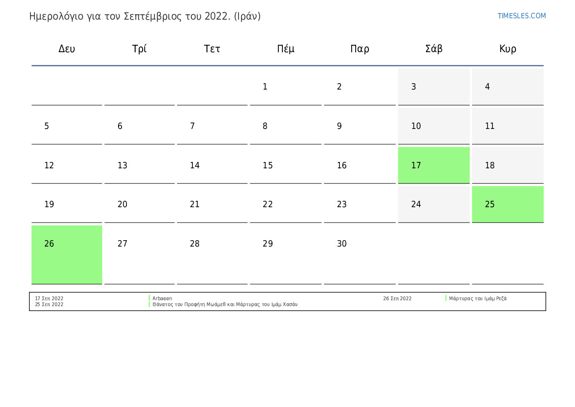 Ημερολόγιο αργιών και Σαββατοκύριακων για το Σεπτέμβριος του 2022 για το Ιράν