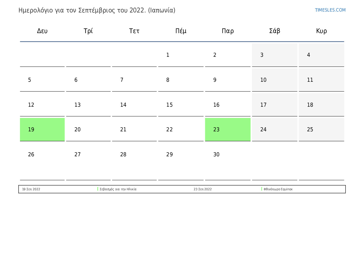 Ημερολόγιο αργιών και Σαββατοκύριακων για το Σεπτέμβριος του 2022 για την Ιαπωνία