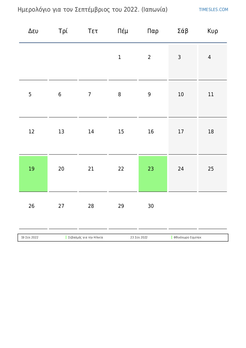 Λήψη και εκτύπωση ημερολογίου PDF με αργίες και σαββατοκύριακα για τον Σεπτέμβριος του 2022 για την Ιαπωνία