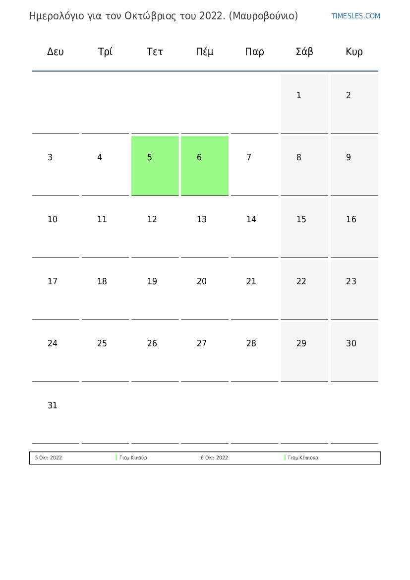 Ημερολόγιο αργιών και Σαββατοκύριακων για το Οκτώβριος του 2022 για το Μαυροβούνιο