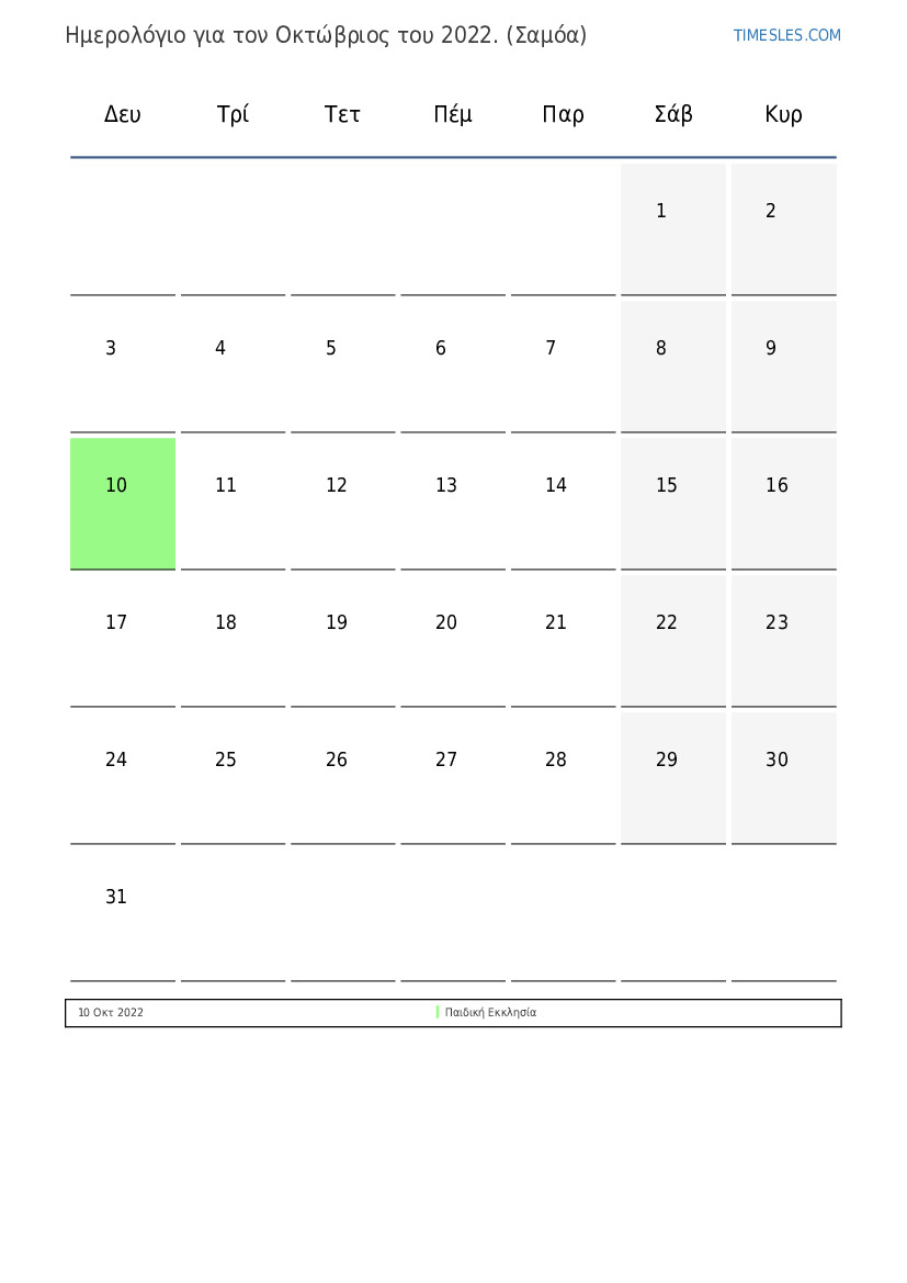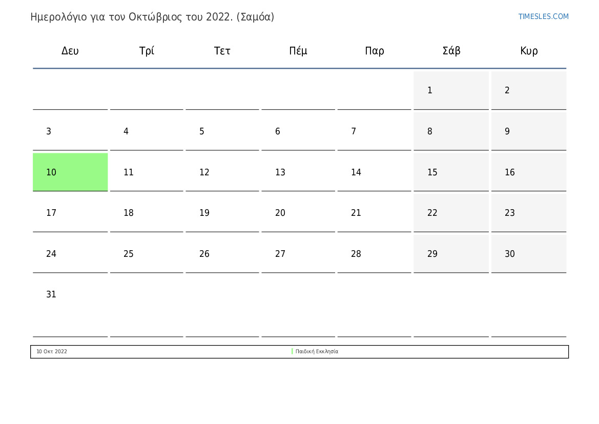 Ημερολόγιο Οκτώβριος 2022 για τη Σαμόα