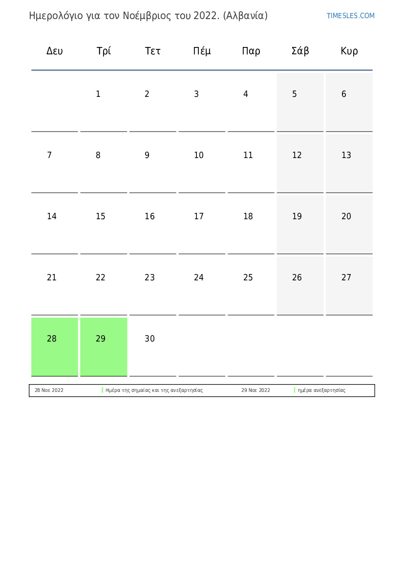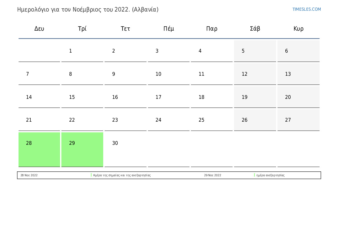 Ημερολόγιο αργιών και Σαββατοκύριακων για το Νοέμβριος του 2022 για την Αλβανία