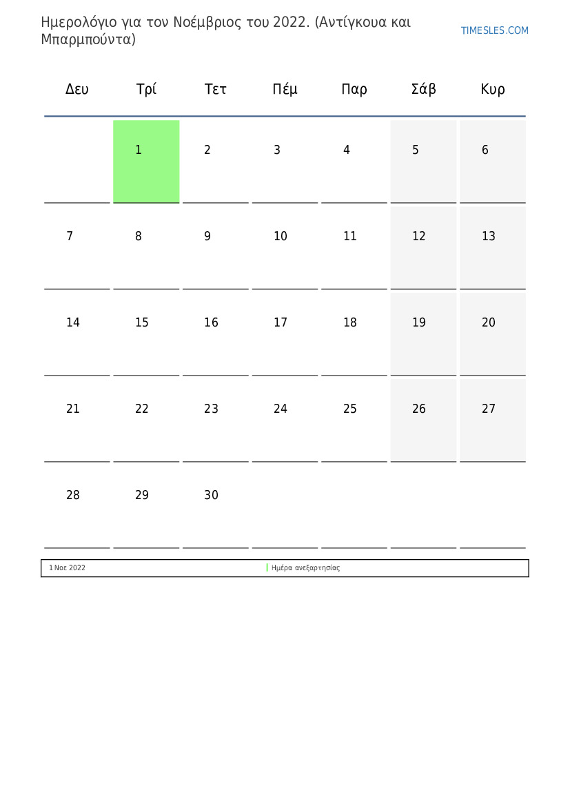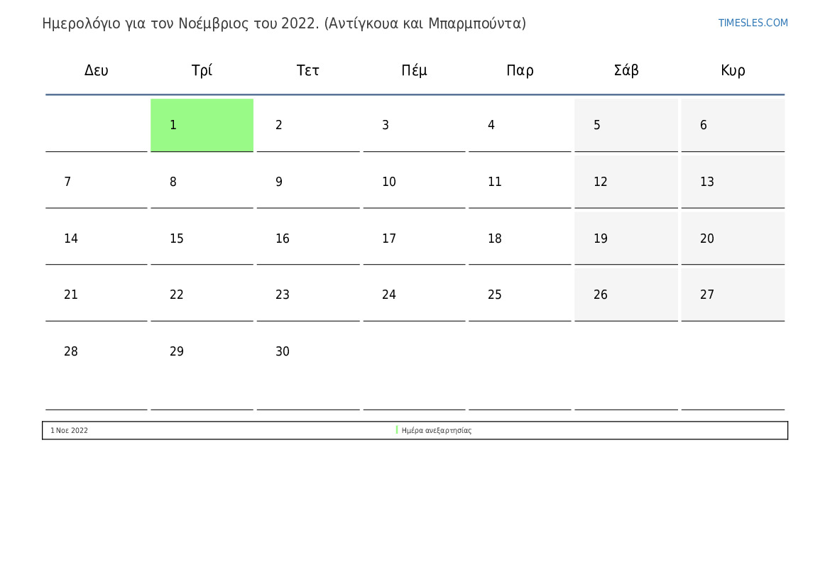 Ημερολόγιο Νοέμβριος 2022 για Αντίγκουα και Μπαρμπούντα