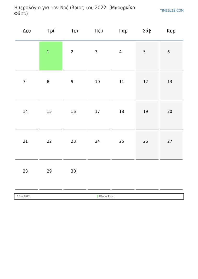 Λήψη και εκτύπωση ημερολογίου PDF με αργίες και σαββατοκύριακα για τον Νοέμβριος του 2022 για την Μπουρκίνα Φάσο
