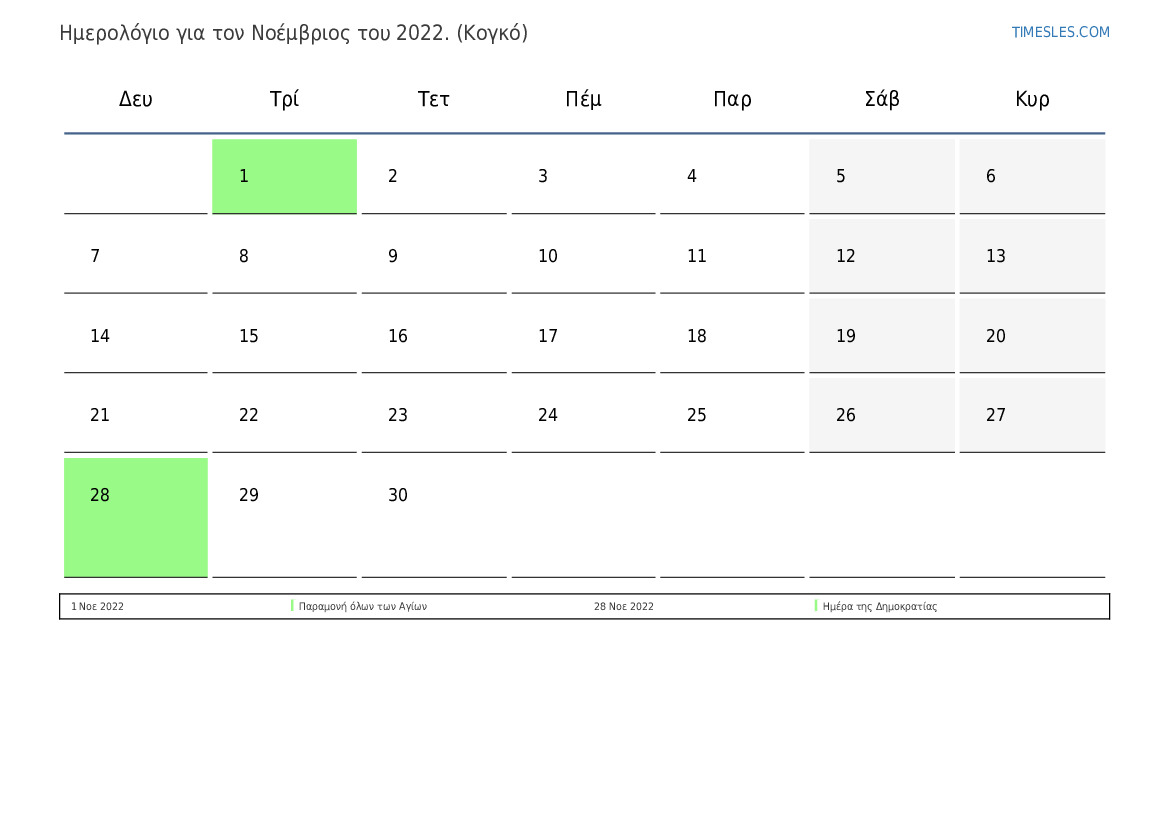 Λήψη και εκτύπωση ημερολογίου PDF με αργίες και σαββατοκύριακα για τον Νοέμβριος του 2022 για το Κονγκό