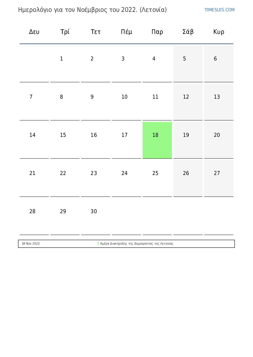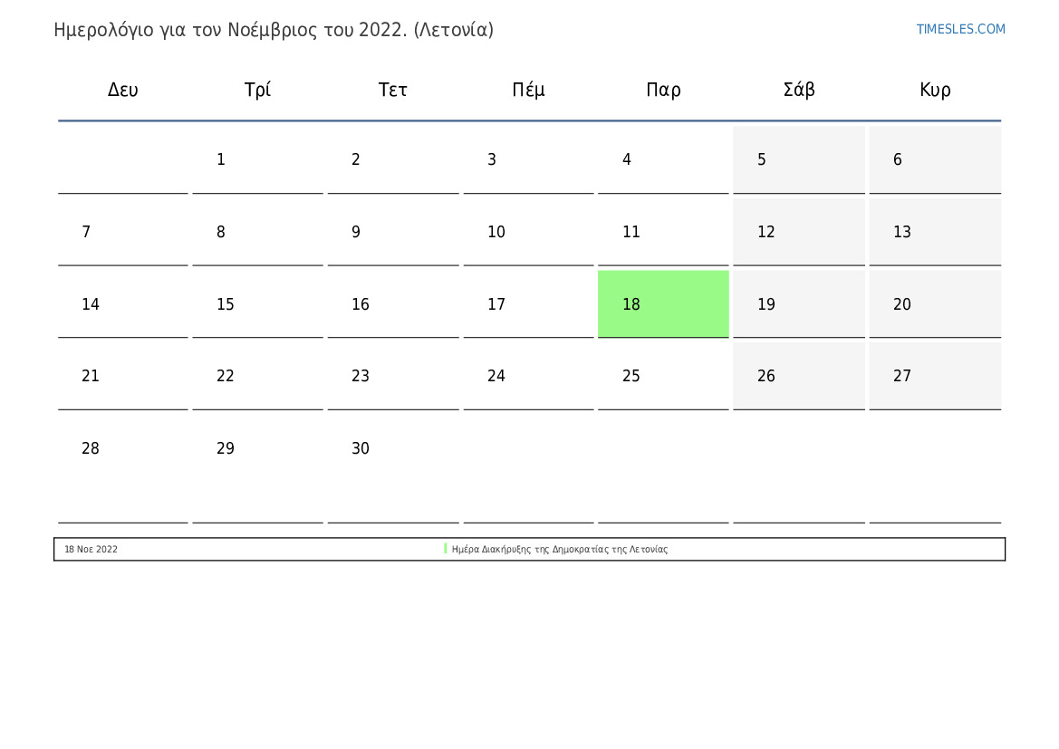 Ημερολόγιο αργιών και Σαββατοκύριακων για το Νοέμβριος του 2022 για τη Λετονία