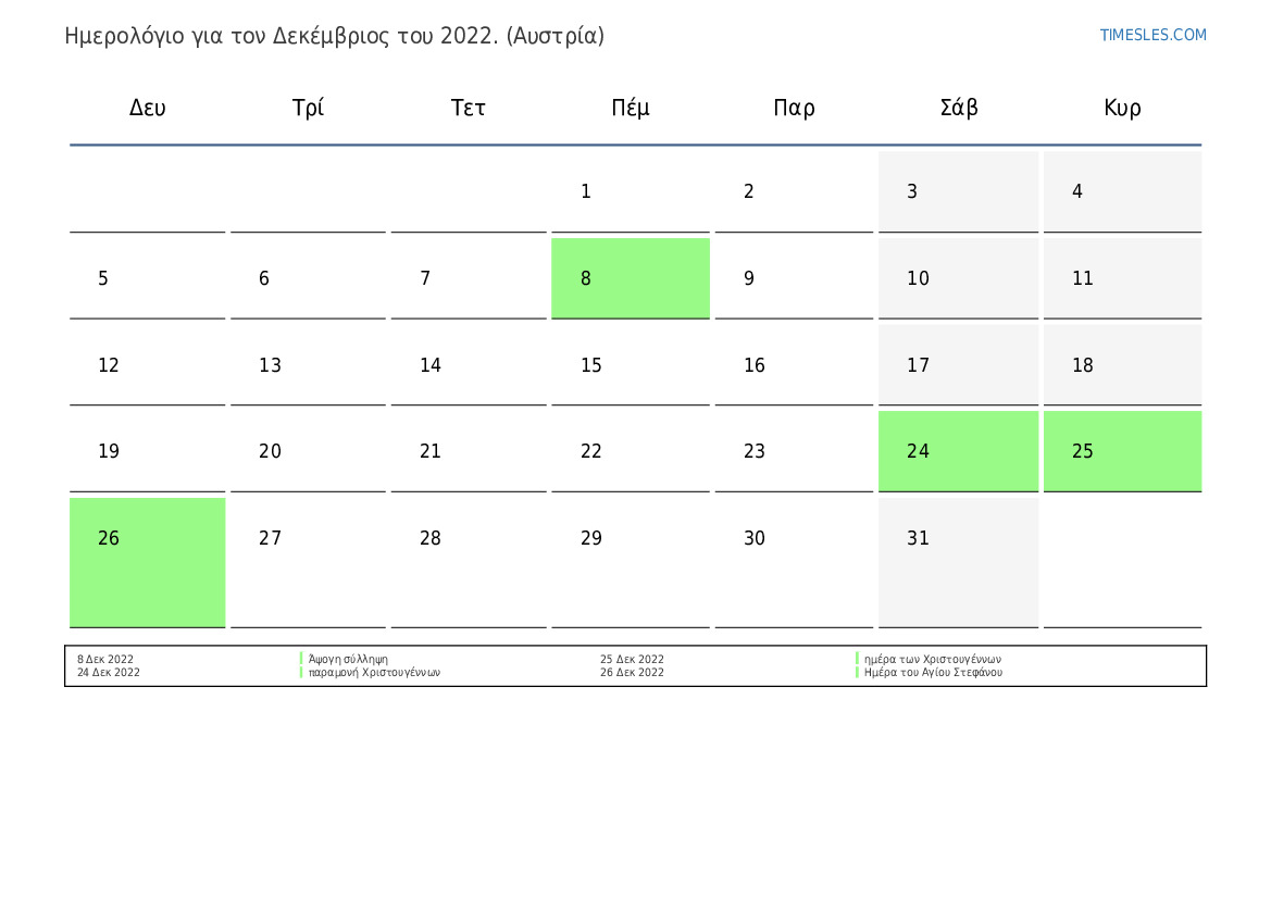 Ημερολόγιο αργιών και Σαββατοκύριακων για το Δεκέμβριος του 2022 για την Αυστρία