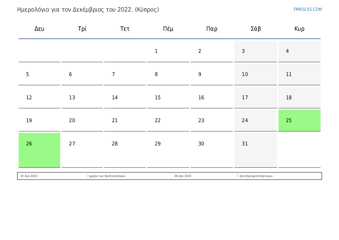 Λήψη και εκτύπωση ημερολογίου PDF με αργίες και σαββατοκύριακα για τον Δεκέμβριος του 2022 για την Κύπρο