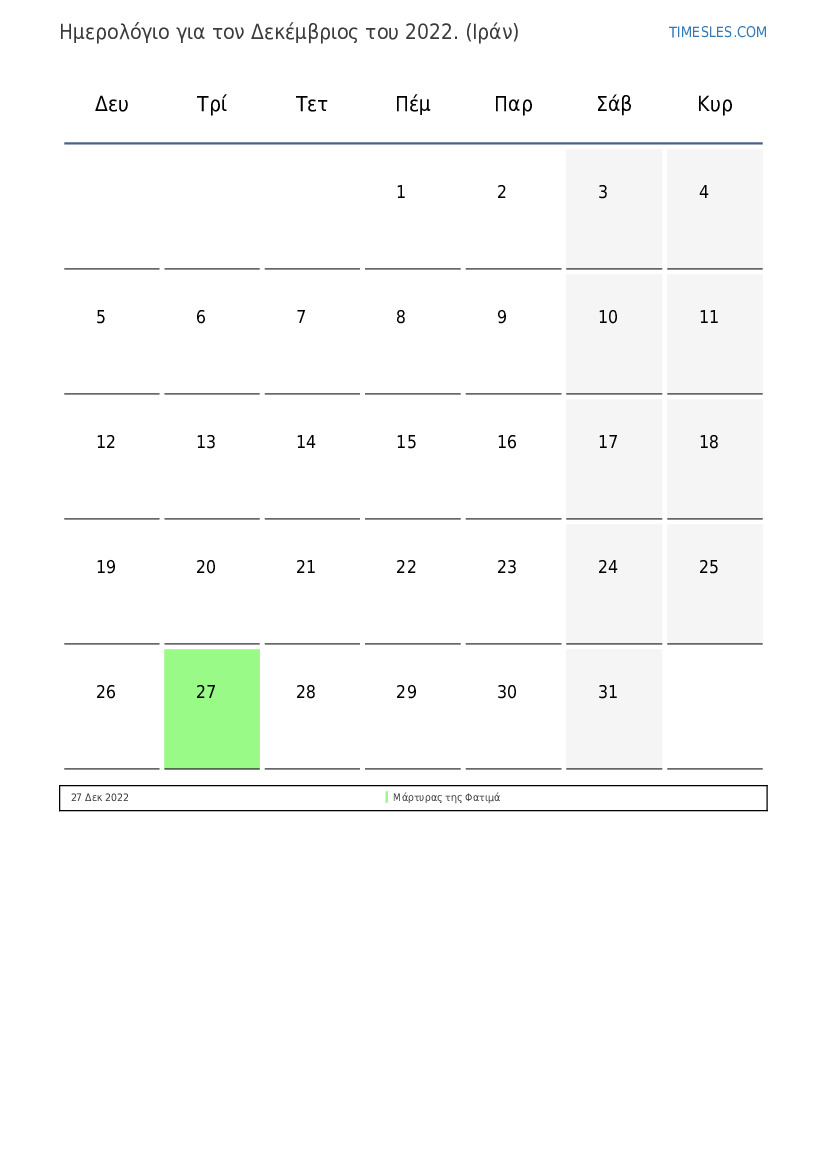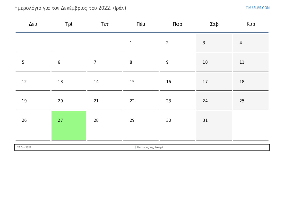 Ημερολόγιο αργιών και Σαββατοκύριακων για το Δεκέμβριος του 2022 για το Ιράν